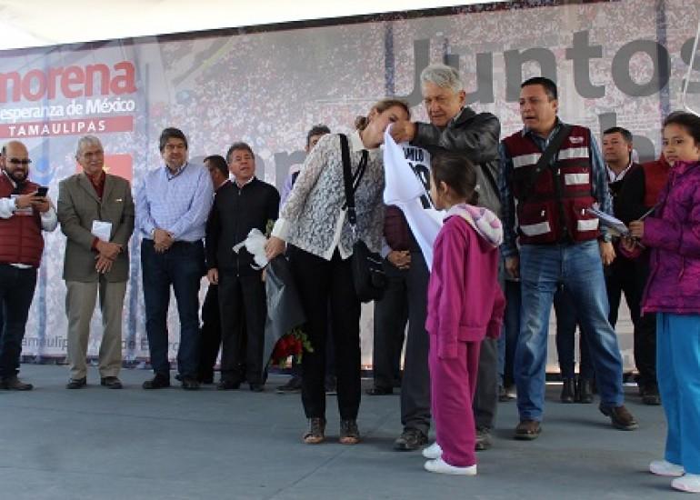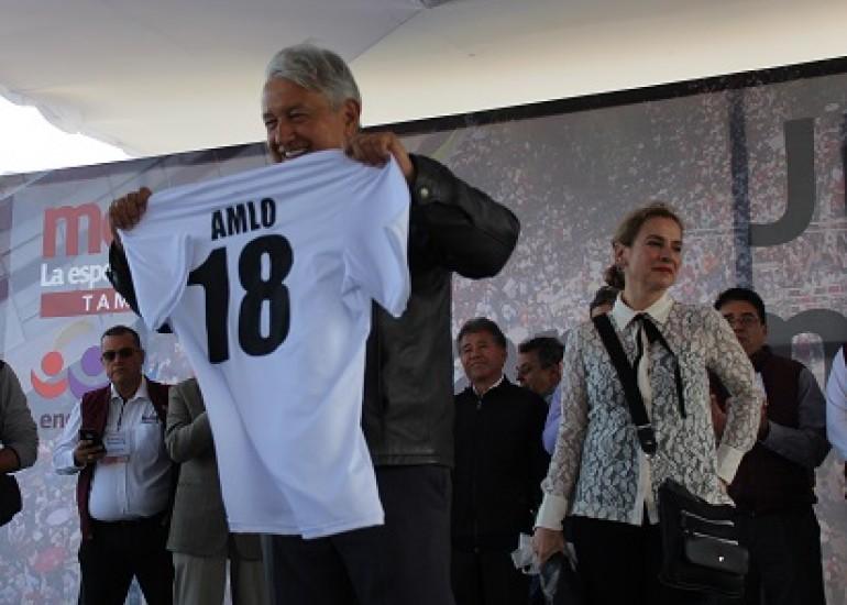 Llegó acompañado de su esposa Beatriz Gutiérrez Maüller, quien casualmente cumplia 49 años, por lo que, sorpresivamente, poco antes de subir al pódium, tras atravesar la larga valla humana, saludando simpatizantes, recibiendo cartitas, mensajes, abrazos y toma de selfies, empezaron a cantarle las mañanitas, entregá¡ndole después, un ramo de rosas rojas. Una pequeña logro "colarse" para entregarle una camiseta impresa con sus iniciales y el número 18, permaneciendo parada en medio de la pareja, esperando a que acabara su discurso AMLO para cumplir su misión