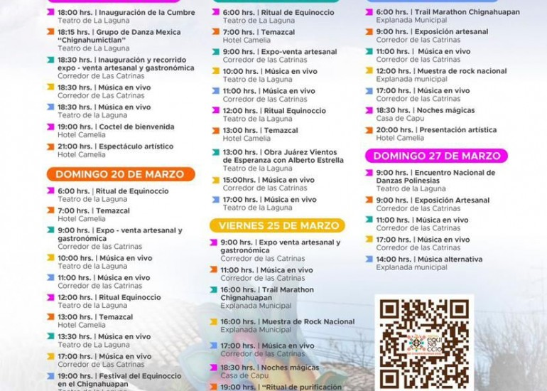 Durante los fines de semana del 19 al 21 de marzo y del 25 al 27 de marzo 2022, el municipio, Chignahuapan, Puebla, ubicado en la serranía del Estado, prepara el Primer Festival Equinoccio 2022 que contempla música en vivo, rituales de bienvenida a la primavera, exposiciones e intervenciones lumínicas en el espacio público de video mapping.