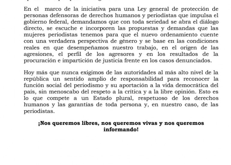 El documento explica con detalle la importancia de abrir el diálogo directo, donde se escuchen e incorporen las propuestas y demandas que las mujeres periodistas en la iniciativa que impulsa el gobierno federal, para generar una Ley general de protección de personas defensoras de derechos humanos y periodistas, argumentando que el nuevo ordenamiento cuente con una verdadera perspectiva de género y se base en las condiciones reales en que las mujeres periodistas desempeñan su trabajo.