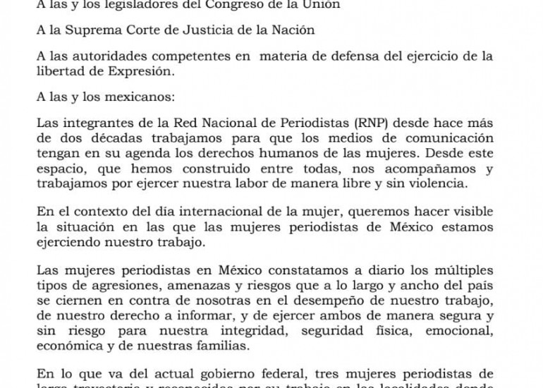 “Las mujeres periodistas en México constatamos a diario los múltiples tipos de agresiones, amenazas y riesgos que a lo largo y ancho del país se ciernen en contra de nosotras en el desempeño de nuestro trabajo, de nuestro derecho a informar, y de ejercer ambos de manera segura y sin riesgo para nuestra integridad, seguridad física, emocional, económica y de nuestras familias”, apuntan.