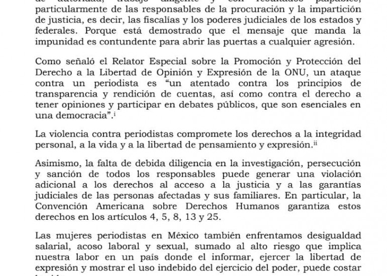 “Las mujeres periodistas en México también enfrentamos desigualdad salarial, acoso laboral y sexual, sumado al alto riesgo que implica nuestra labor en un país donde el informar, ejercer la libertad de expresión y mostrar el uso indebido del ejercicio del poder, puede costar la vida”.