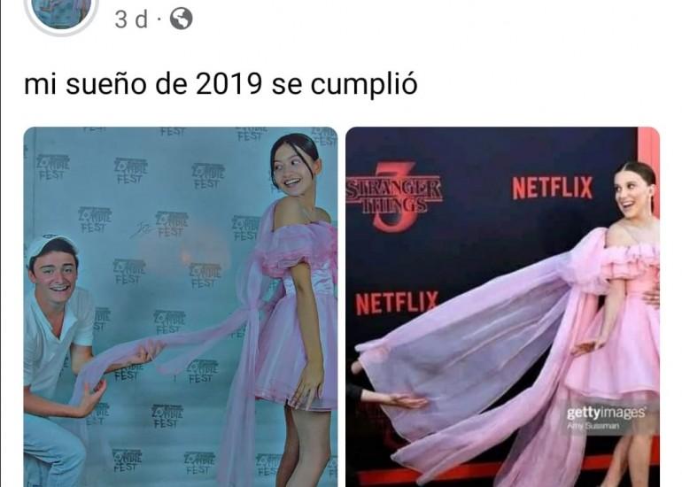 América muy emocionada publicó su fotografía a lado del actor con el mismo vestido que uso la protagonista de esta serie Millie Bobby Brown, el cual fue hecho a su medida para su celebración de quince años, pero su intención era que ese atuendo sería utilizado para la recreación de ese momento hace unos años.