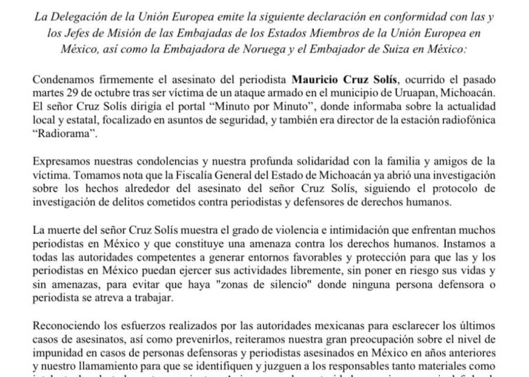 En su declaración, la UE, Noruega y Suiza manifestaron solidaridad con la familia y amigos de Cruz Solís y subrayaron la urgente necesidad de garantizar la seguridad para los periodistas en México. “La muerte del señor Cruz Solís muestra el grado de violencia e intimidación que enfrentan muchos periodistas en México y constituye una amenaza contra los derechos humanos”, reza el comunicado. La delegación llamó a las autoridades mexicanas a fortalecer los mecanismos de protección para evitar la creación de «zonas de silencio» donde nadie se atreva a informar o defender derechos humanos.