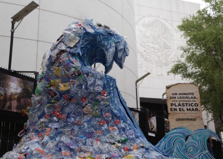 Ciudad de México, abril de 2019.- La organización ambientalista Greenpeace México, instaló una ola de plástico de más de dos metros de altura frente a las instalaciones del Senado de la República donde se llevó a cabo la discusión para acordar los términos de la legislación que regule los plásticos de un solo uso.