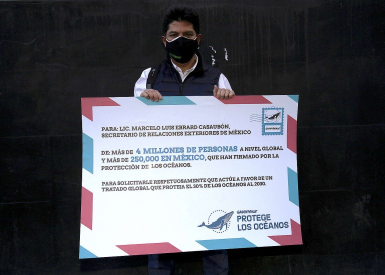 Con un reloj gigante y la advertencia ““El tiempo se acaba para nuestros océanos. Actúa ya”, en las instalaciones de la Secretaria de Relaciones Exteriores (SRE), Greenpeace México pide al Canciller Marcelo Ebrard Casaubón a actuar con determinación y asumir el liderazgo de América Latina en la Cuarta Conferencia Intergubernamental (IGC4) a favor de proteger el 30 por ciento de los océanos para el 2030.