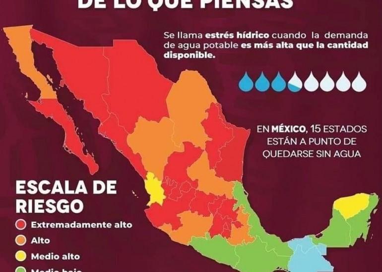 El estrés hídrico ocurre cuando la demanda del líquido es más alta que la almacenada, El WRI mide el estrés hídrico con una escala de 1 a 5, en la que cinco significa extremadamente alto estrés hídrico y 1, un bajo estrés hídrico. Y es que dicho estudio establece que entidades del norte de México como Nuevo León, Chihuahua, Sonora y Tamaulipas se encuentran en riesgo extremadamente alto de quedarse sin agua.