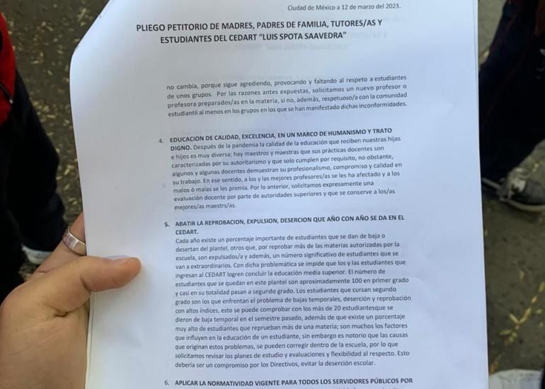 Ciudad de México, marzo 15 de 2023.- Tras reiteradas peticiones de atención y demandas para que la directiva atendiera su clamor y justas demandas, este miércoles 15 de marzo, padres y madres de familia del CEDART "Luis Spota Saavedra" se plantaron en las inmediaciones de la institución tras no haber tenido respuestas, ni soluciones a múltiples solicitudes, denuncias y pronunciamientos exigiendo de forma inmediata el cumplimiento cabal a las demandas presentadas en un pliego petitorio.