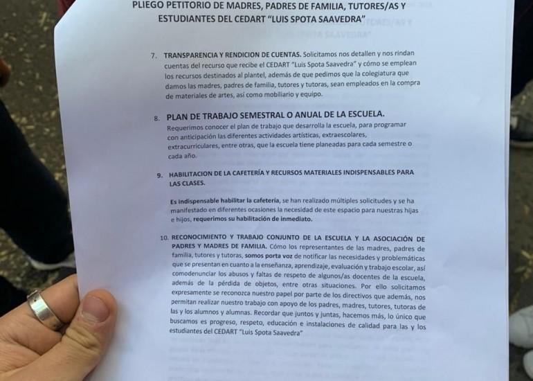 Entre otras cosas también exigen rendición de cuentas y conocer el plan de trabajo que desarrolla la escuela, para programar con anticipación las diferentes actividades artísticas, extraescolares, extracurriculares.