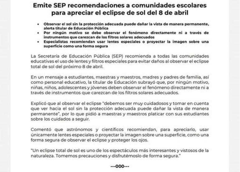 Emite SEP recomendaciones a comunidades escolares para apreciar el eclipse de sol del 8 de abril