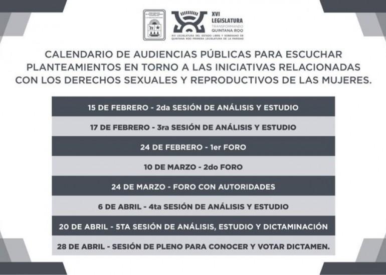 El 18 de enero Miranda García presentó un calendario y ruta de trabajo en torno a las iniciativas sobre derechos sexuales y reproductivos de las mujeres. De acuerdo con este plan, el 15 y 17 de febrero y el 6 de abril se realizarán las sesiones de comisiones para el análisis y estudio; y el 24 de febrero y el 10 de marzo se llevarán a cabo foros de análisis. Se prevé que en abril se vote un dictamen.