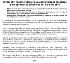 Emite SEP recomendaciones a comunidades escolares para apreciar el eclipse de sol del 8 de abril