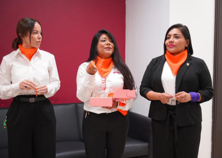 Durante la mañana Cynthia Canturosas Villarreal, presidenta del Consejo Consultivo del INMUJER; Cynthia Rodríguez Leija, directora del INMUJER, acompañadas del personal del Instituto y de la regidora Leticia Meneses entregaron distintivos color naranja al personal del gobierno municipal.