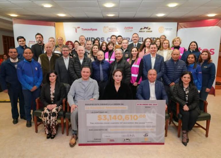 En conferencia de prensa, la alcaldesa Carmen Lilia Canturosas Villarreal, junto al diputado local Sergio Ojeda Castillo, presidente del Club Rotario Nuevo Laredo; Mario Palos Garza, presidente de Fundación PG Maratones; y la Dra. Liliana Arjona Barocio, secretaria de Bienestar Social, dio a conocer los detalles de la campaña y reiteró el compromiso de la administración de atender y prevenir enfermedades en las familias de Nuevo Laredo.