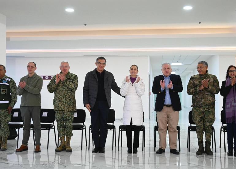 Se trató de una obra desarrollada desde una visión integral en 29 hectáreas con 320 mil metros cuadrados de construcción, generando más de 3 mil 700 empleos directos y 7 mil indirectos. Detalló que el edificio principal tiene capacidad de mil 100 personas y cuenta con 600 viviendas para trabajadores y sus familias, así como espacios de recreación. Agregó que a esta obra se suma la construcción, por parte de la Defensa Nacional, de siete secciones aduaneras en Baja California, 12 en Sonora, nueve en Chihuahua, cuatro en Coahuila y 16 en Tamaulipas, que concluyeron en 2024 y que están equipadas con aparatos de última tecnología como detectores de mercancía para evitar contrabando, laboratorios móviles de hidrocarburos, rayos X móviles, ferroviarios, vehiculares y para maletas.