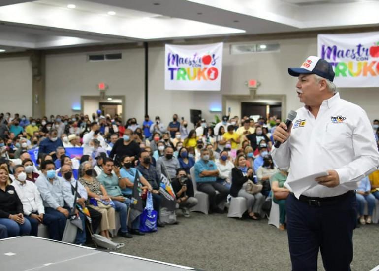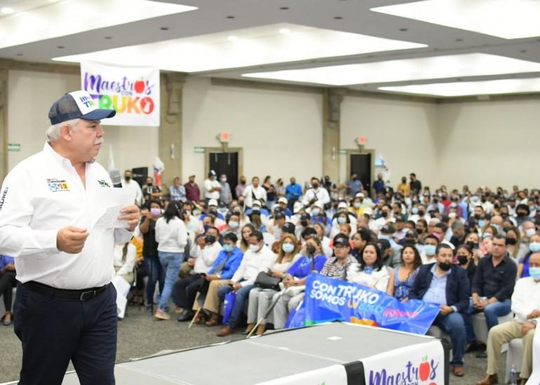 .Los docentes en activo, jubilados, y de los diferentes niveles educativos al grito unísono de “Truko gobernador”, recibieron entre banderas y parabienes al candidato de la Coalición “Va por Tamaulipas”, para acto seguido, iniciar con un encuentro en el que se abordaron las áreas de oportunidad que este sector tiene.