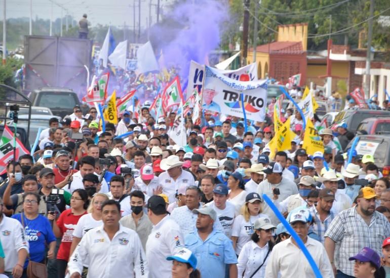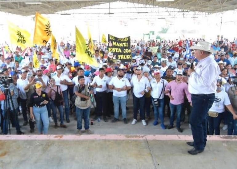Poblado Loma Alta, Gómez Farías, Tamaulipas.- Ex alcaldesas y ex alcaldes de Gómez Farías, así como líderes sociales muestran la fuerza y unidad que representa el Candidato César Truko Verástegui. Después de una caminata con miles de ciudadanos, el abanderado de Va por Tamaulipas, César Truko Verástegui, resaltó las propuestas de su Gobierno, entre las que destaca la construcción de un hospital general y el equipamiento de los centros de salud.