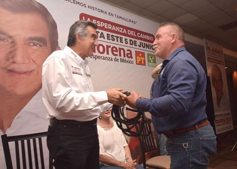 MATAMOROS, Tam.- El doctor Américo Villarreal Anaya recibió las riendas para que gobierne y lleve el estado de Tamaulipas por buen camino.Carmelo Villalón Jaramillo, cabalgante del Ejido San Lorenzo fue quien le hizo entrega de unas riendas de cuero realizadas por talabarteros y artesanos de la localidad, al candidato común a la gubernatura por los partidos Morena, PT y Verde Ecologista.