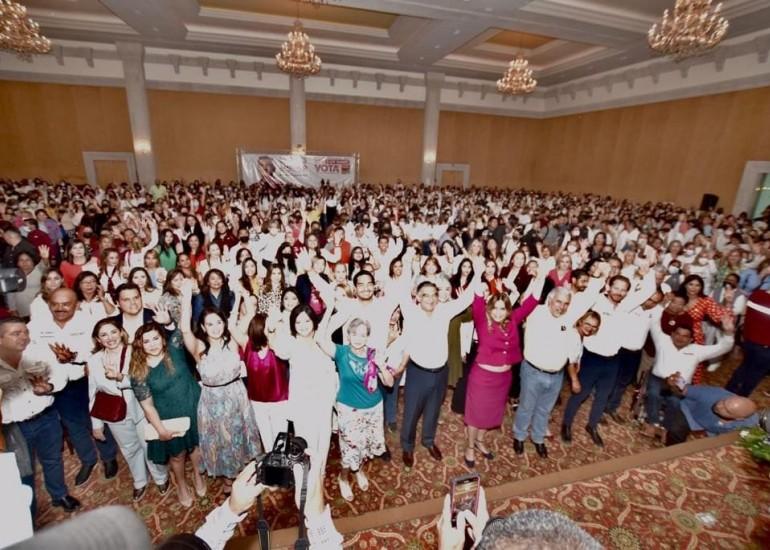Ante cientos de mujeres, el candidato común a la gubernatura por los partidos Morena, PT y Verde Ecologista, recibió el apoyo de la doctora Maki, que le levantó la mano y coreó: “Gobernador… Gobernador, gobernador”.