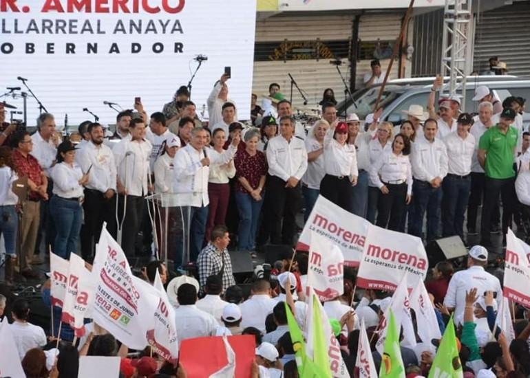 "Es la hora, es el momento de Tamaulipas y es con Américo, quien habrá de liberar de la opresión al Estado. Américo será gobernador", expresó el secretario de Gobernación quien esta vez vino de militante morenista a apoyar al doctor Américo Villarreal. Al participar en el cierre de campaña del candidato a la gubernatura del Estado por Morena, PVEM y PT, Adán Augusto López alertó que desde el gobierno del Estado quieren sembrar una noche de terror el próximo 5 de junio, pero advirtió que no se los vamos a permitir.