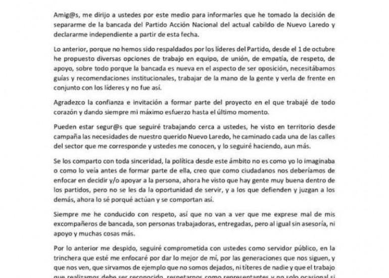 En un documento dirigido a la dirigencia estatal del PAN, la regidora expone que ha propuesto diversas opciones de trabajo en equipo, de unión, de empatía, de respeto, que fueron rechazadas y sin interés por parte del panismo y la campaña de César “Truko” Verástegui.