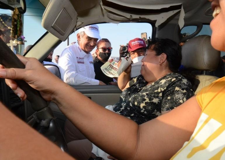 El candidato común de los partidos Morena, Verde Ecologista y del Trabajo, regaló gorras, pegotes y habló con automovilistas de la colonia que lleva el nombre de su padre.