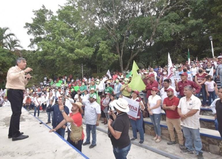 GÓMEZ FARÍAS, Tam.- Desde la puerta de "El Cielo", rodeado de árboles y exigencias de cañeros que pedían en cartulinas el rescate del Ingenio de Xicoténcatl, el doctor Américo Villarreal Anaya, candidato de la coalición “Juntos Hacemos Historia”, propuso decirle adiós este 5 de junio a los gobiernos del PRIAN.