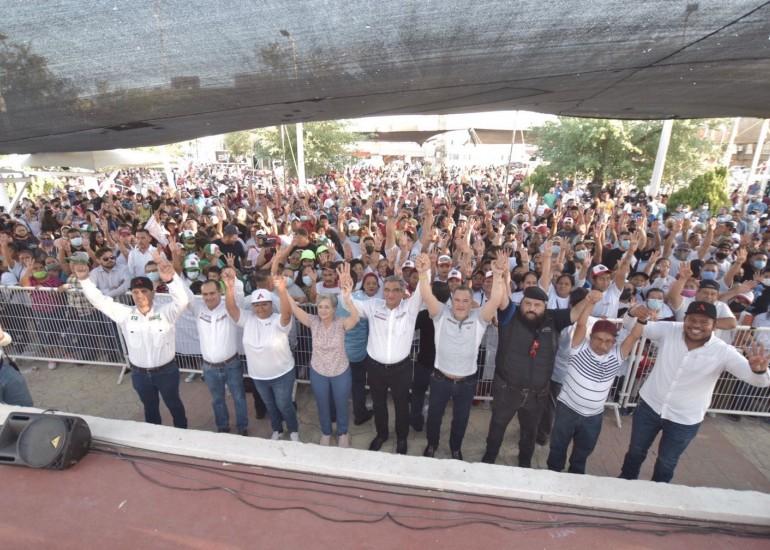 Recordó que gracias a la política humanista se logró que el salario en la frontera aumentara significativamente y dijo que esa misma línea será la que se aplique en su gobierno y les dijo que en este municipio, hay grandes proyectos que beneficiarán a toda la base trabajadora que día a día se levanta para sacar adelante a su familia.