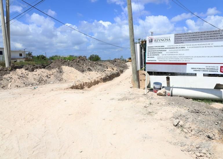 El Gobierno de Reynosa construye, con un presupuesto de 3 Millones 814 Mil 024.60 Pesos, un colector de aguas residuales de 12 pulgadas de diámetro, que beneficiará a los habitantes de la colonia Las Delicias y aportará mayor eficiencia a la condición del drenaje en el sector.