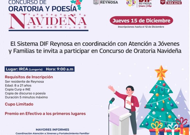 El Sistema DIF Reynosa que encabeza Carlos Luis Peña Garza, en coordinación con el programa Atención a Jóvenes y Familias, invita a participar en el Concurso de Poesía y Oratoria Navideña, que se realizará en las instalaciones del Instituto Reynosense para la Cultura y las Artes (IRCA) Longoria, el jueves 15 de diciembre a las 9:00 de la mañana.