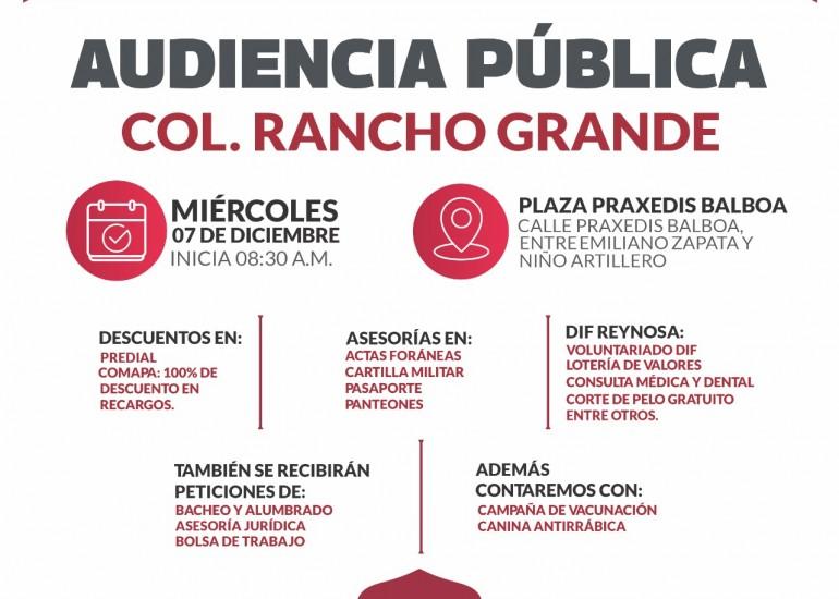 La Secretaría de Desarrollo Social, del Gobierno Municipal de Reynosa, invita a los habitantes de la colonia Rancho Grande, a asistir este miércoles 7 de diciembre a la Audiencia Pública que presidirá el Alcalde Carlos Peña Ortiz, en la plaza pública de la calle Praxedis Balboa, entre Emiliano Zapata y Niño Artillero.