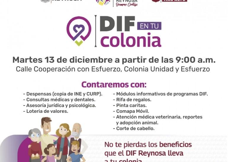 El Sistema DIF Reynosa que encabeza Carlos Luis Peña Garza, beneficiará a las familia de la colonia Unidad y Esfuerzo, con el programa "DIF en Tu Colonia".
