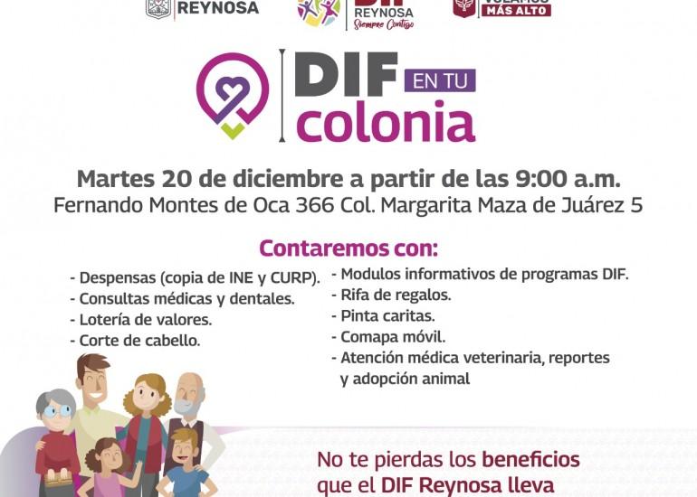 El Sistema DIF Reynosa que encabeza Carlos Luis Peña Garza, llevará el programa "DIF Reynosa en Tu Colonia" al sector de la Margarita Maza de Juárez.