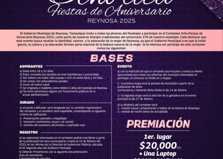El certamen se dividirá en dos etapas para las concursantes; que tendrán la oportunidad de resaltar la identidad, valores y la educación de la mujer de Reynosa, por ser la inteligencia, cultura y educación parte esencial de la belleza natural de la mujer; los detalles están incluidos en la Convocatoria.