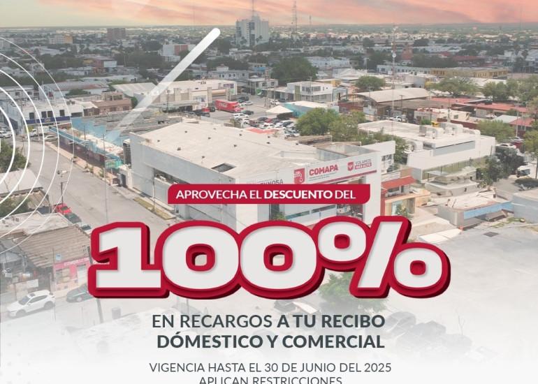 Por instrucciones del Presidente Municipal, Carlos Peña Ortiz, la Comapa Reynosa mantiene vigente el 100% de descuento en recargos por adeudo al realizar su pago en una sola exhibición. Esta medida busca facilitar a los usuarios el ponerse al corriente con su servicio de agua potable y contribuir al fortalecimiento de la infraestructura hídrica de la ciudad.