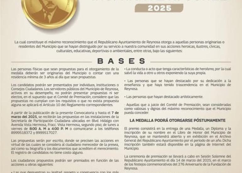 El Gobierno Municipal de Reynosa, que preside el Alcalde Carlos Peña Ortiz, invita a personas originarias o residentes de esta ciudad, a participar como candidatos a la Medalla al Mérito "Ing. Marte R. Gómez" 2025, una distinción que se otorga anualmente a un reynosense destacado por su servicio a la comunidad, por sus acciones heroicas, ilustres, cívicas, culturales, educativas, deportivas o ambientales, entre otras.