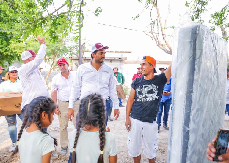 "Estamos aquí para ayudar, para tender la mano y brindar esperanza en momentos difíciles", aseguró el Alcalde, mientras entregaba, casa por casa, colchones, parrillas, despensas y kits de limpieza a los habitantes de la colonia.