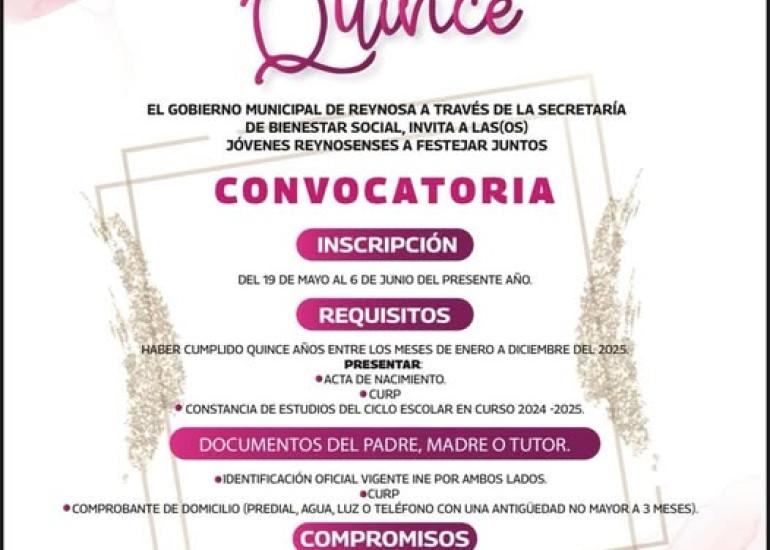 El Gobierno que preside el Alcalde Carlos Peña Ortiz, invita a través de la Secretaría de Bienestar Social, a jovencitas y jóvenes reynosenses a participar en la Convocatoria “Mis Quince”, para celebrar a quienes cumplen 15 años este 2025.