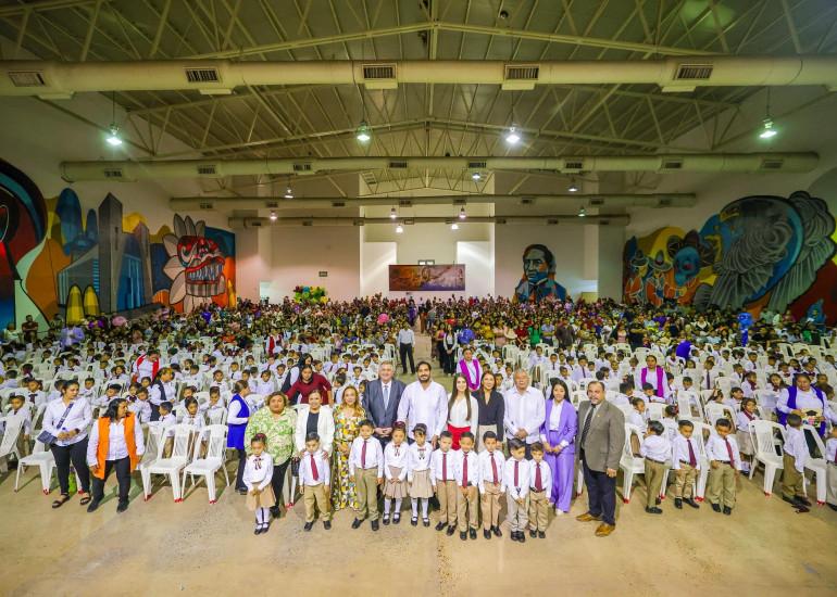 El evento encabezado por el Alcalde de esta ciudad, acompañado por la Presidenta del Voluntariado DIF-Reynosa, Alejandra Yelitza Garza, dio por concluidos los cursos de 850 menores que cursaron su educación preescolar y están listos para ingresar a la Primaria, luego de una excelente preparación con Maestras calificadas para la enseñanza en los Centros que dirige la Lic. Briseida Yalili Oyoque Cortez.