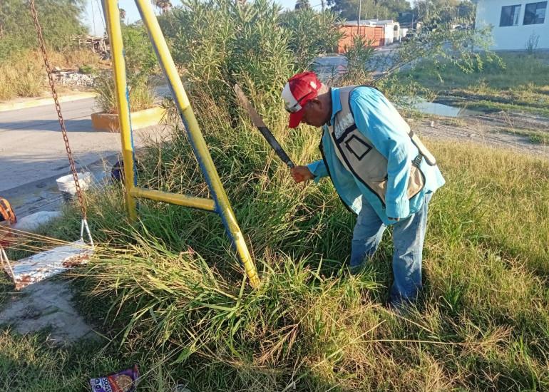 Otra labor es la eliminación de maleza en calles de la colonia con el objetivo de brindar bienestar a las familias de Reynosa, mejorar la seguridad y promover la convivencia en espacios públicos dignos.