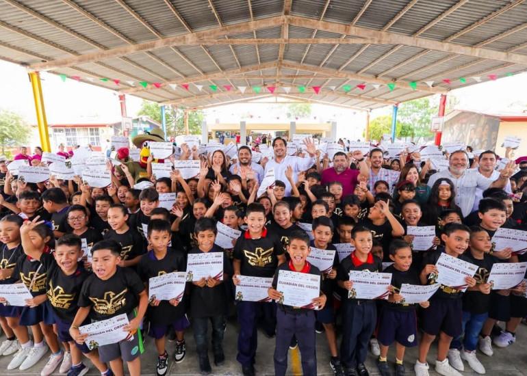 "El día de hoy ya son Guardianes del Orden, aprendieron a cuidar el medio ambiente, no tirar basura; todo eso es importante para nuestra ciudad, debemos evitar que haya quien tire basura en lugares clandestinos porque debe ir en el basurero o el contenedor, gracias por ayudar", dijo el Alcalde a la emocionada comunidad escolar de la Primaria Moctezuma.