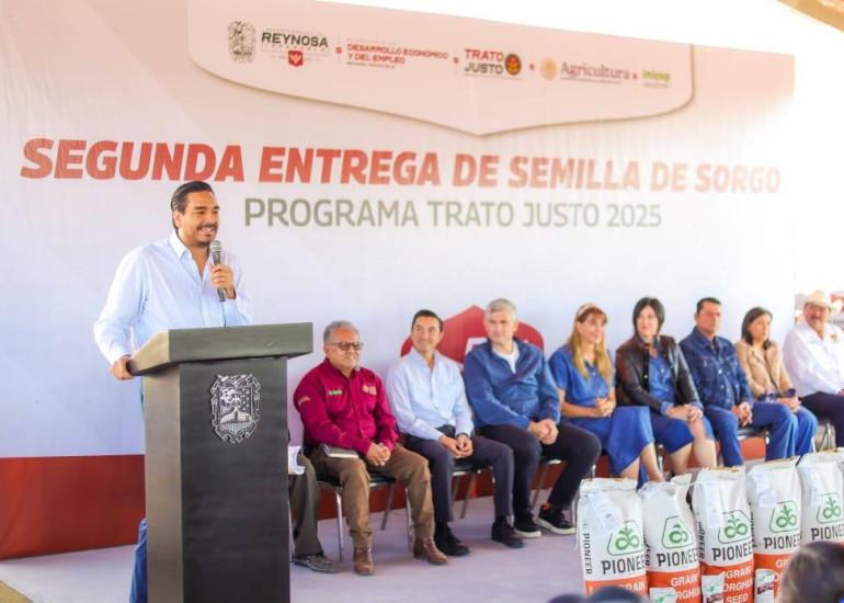 "Me uno a las palabras de agradecimiento y reconocimiento hacia Carlos Víctor Peña Ortiz, Alcalde de Reynosa, por el programa Trato Justo, que ha sido un verdadero apoyo para las familias campesinas", dijo con emoción ante familias del campo, el señor Eleodoro Quintero Ballesteros, en presencia de la Senadora Maki Esther Ortiz Domínguez y los Diputados Casandra Priscila De los Santos Flores, Claudia Alejandra Hernández Sáenz y Juan Carlos Zertuche Romero.