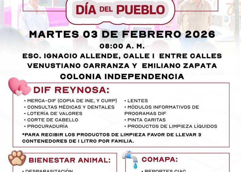 El Sistema DIF Reynosa que encabeza Carlos Luis Peña Garza, realizará la Brigada"DIF en Tu Colonia", el martes 03 de febrero, a partir de las 08:00 de la mañana, en la Escuela "Ignacio Allende", ubicada en la calle I, entre Venustiano Carranza y Emiliano Zapata, en la colonia Independencia, con el objetivo de acercar servicios y apoyos a las familias del sector.