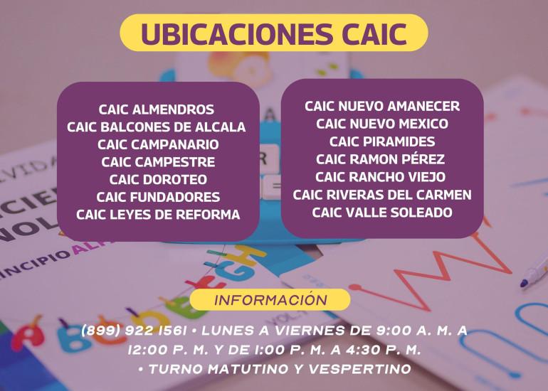 Los CAIC se encuentran distribuidos en colonias como Almendros, Balcones de Alcalá, Campanario, Campestre, Doroteo, Fundadores, Leyes de Reforma, Nuevo Amanecer, Nuevo México, Pirámides, Ramón Pérez, Rancho Viejo, Riveras del Carmen y Valle Soleado, brindando atención en turnos matutino y vespertino.