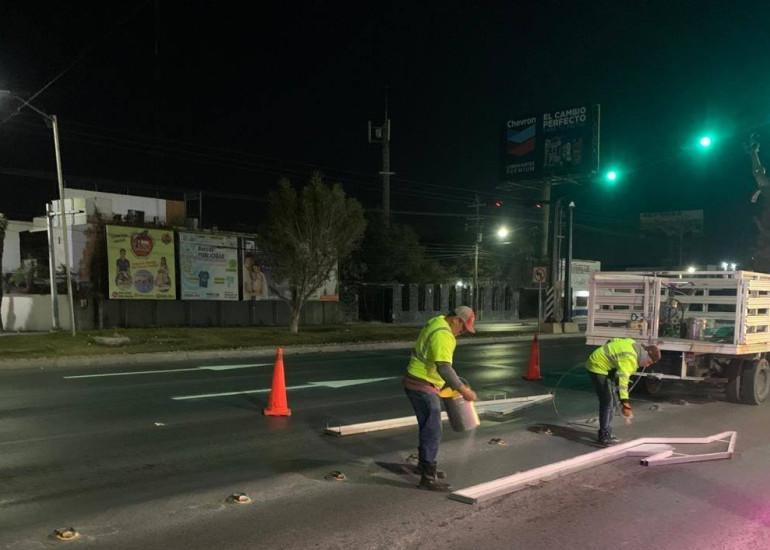 Mediante un programa intensivo nocturno y dando seguimiento a las instrucciones del Presidente Municipal Carlos Peña Ortiz, cuadrillas de Servicios Públicos aplicaron pintura termoplástica en cruces peatonales y áreas especiales de la avenida Rodolfo Garza.