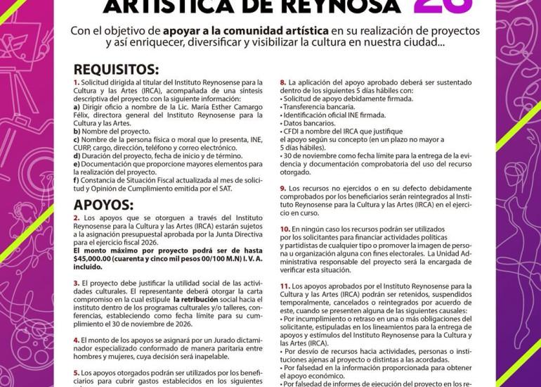 El Gobierno de Reynosa, que preside el Alcalde Carlos Peña Ortiz, invita a la comunidad artística a participar en la Convocatoria de Estímulos Económicos 2026 lanzada por el Instituto Reynosense para la Cultura y las Artes.