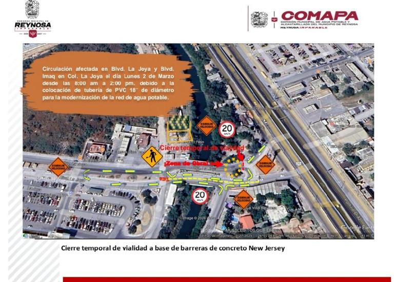 La Comisión Municipal de Agua Potable y Alcantarillado de Reynosa informa a la ciudadanía que, como parte de los trabajos de modernización de la red de agua potable, este lunes 2 de marzo permanecerá cerrado a la circulación el tramo del bulevar La Joya y bulevar IMAQ, en la colonia La Joya.