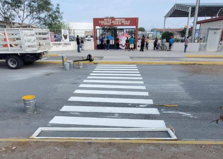 El Alcalde Carlos Peña Ortiz impulsa acciones para la protección de la población escolar en Reynosa. Este día, lunes 9 de marzo, se realiza el pintado de cruces peatonales de la escuela primaria Rosalba Francisca González Morales, ubicada en la calle Rosario #305, del fraccionamiento Lomas del Real de Jarachina Norte.