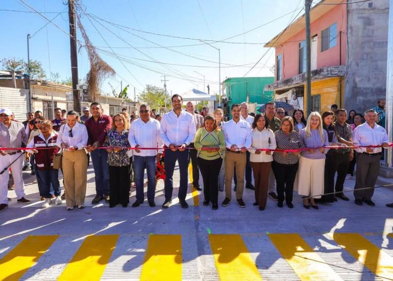 "Me enseñan las fotos de cómo estaba aquí antes, pues era un río, también tenía maleza, y el día de hoy pues como ustedes pueden ver ya está una calle más pavimentada", dijo el Alcalde, que fue respondido en coro por las familias: "¡una calle más, una calle más, una calle más!".
