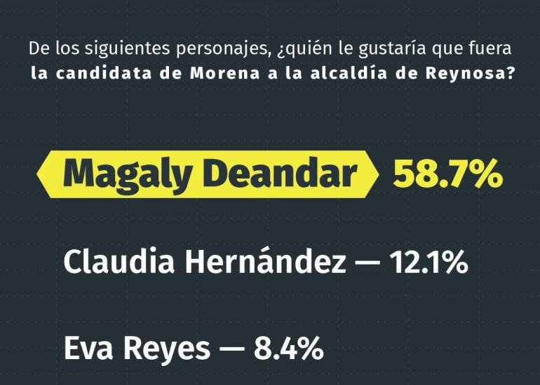 De acuerdo con la medición, Deándar registra 58.7% de preferencia en un escenario interno del partido. En la misma encuesta, la diputada federal Claudia Hernández obtiene 12.1%, mientras que otra aspirante alcanza 8.4%. Un 20.8% de los encuestados señaló no tener aún una preferencia definida.