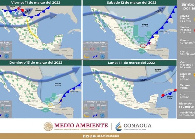 El Gobierno Municipal, a través de la Coordinación de Protección Civil y Bomberos, recomienda a la comunidad tomar medidas de prevención ante la llegada de un nuevo frente frío, este viernes 11 de marzo. La información compartida por el Servicio Meteorológico Nacional indica que la temperatura descenderá desde los 30 Centígrados hasta una mínima de 5 con vientos del norte de 30 a 50 km/h y 20% de posibilidad de lluvia.